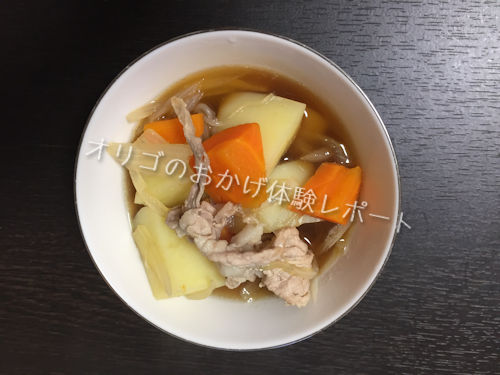 - じゃがいもが煮えたら白滝とめんつゆとオリゴのおかげダブルサポート顆粒を入れ、好みの味に整えたら更に一煮立ちさせてできあがり。