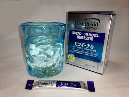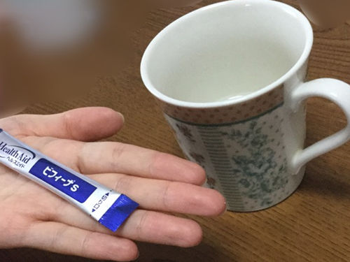 コップ一杯の水とビフィーナSを1袋、さっそく飲む事にしました。