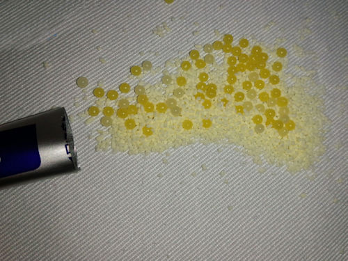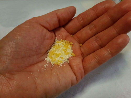 黄色と淡黄色の二色の粒と、レモン風味の顆粒が混ざっています。